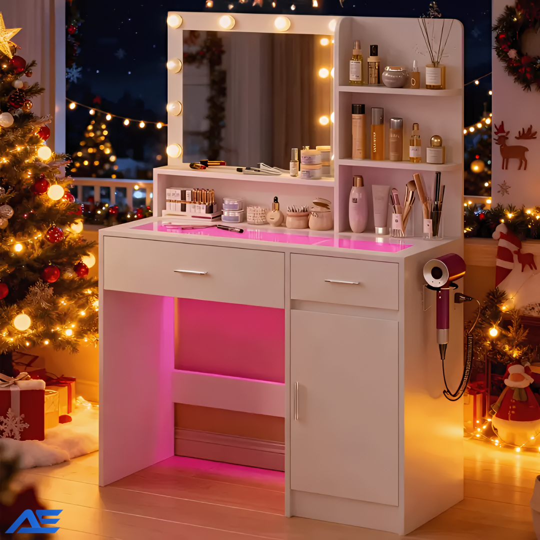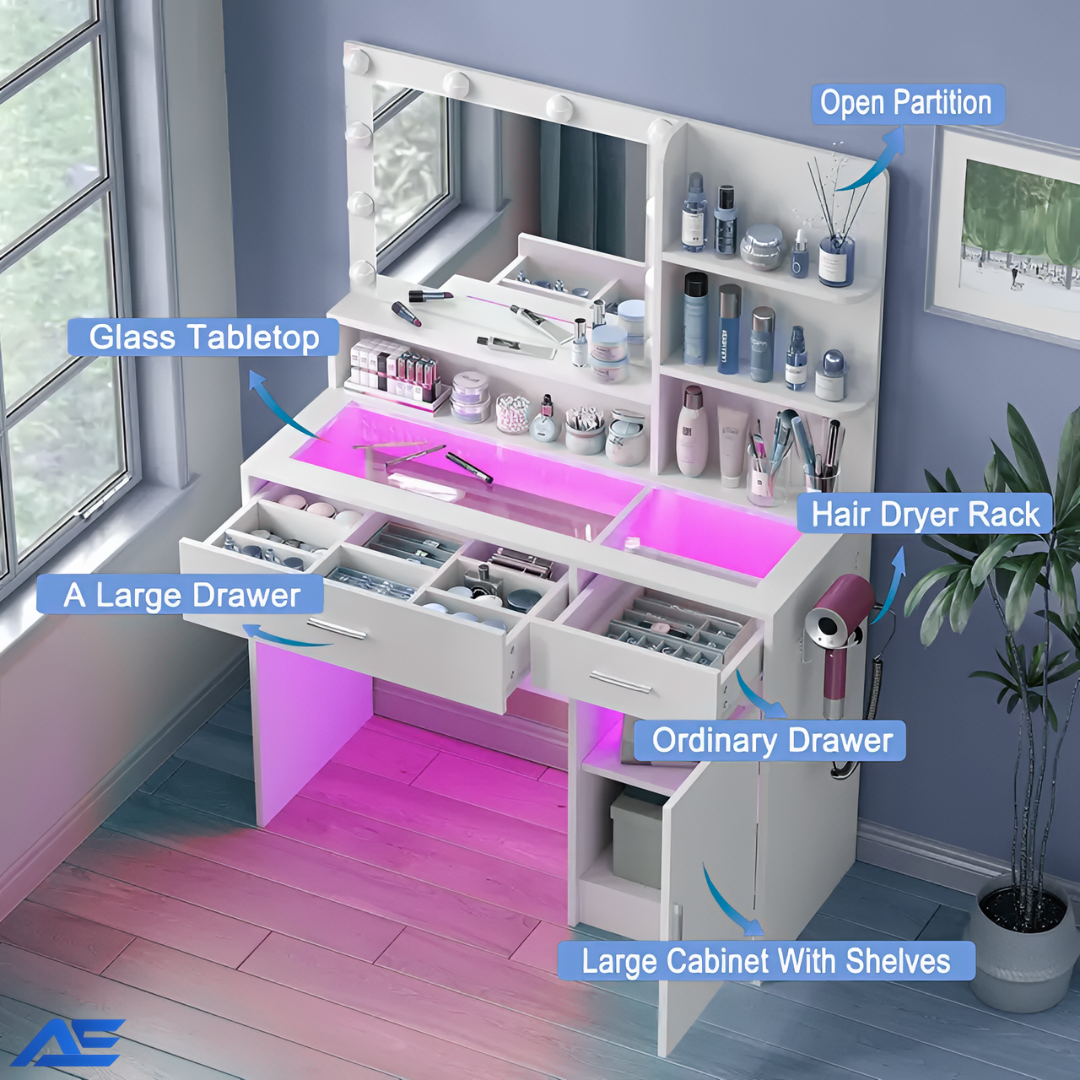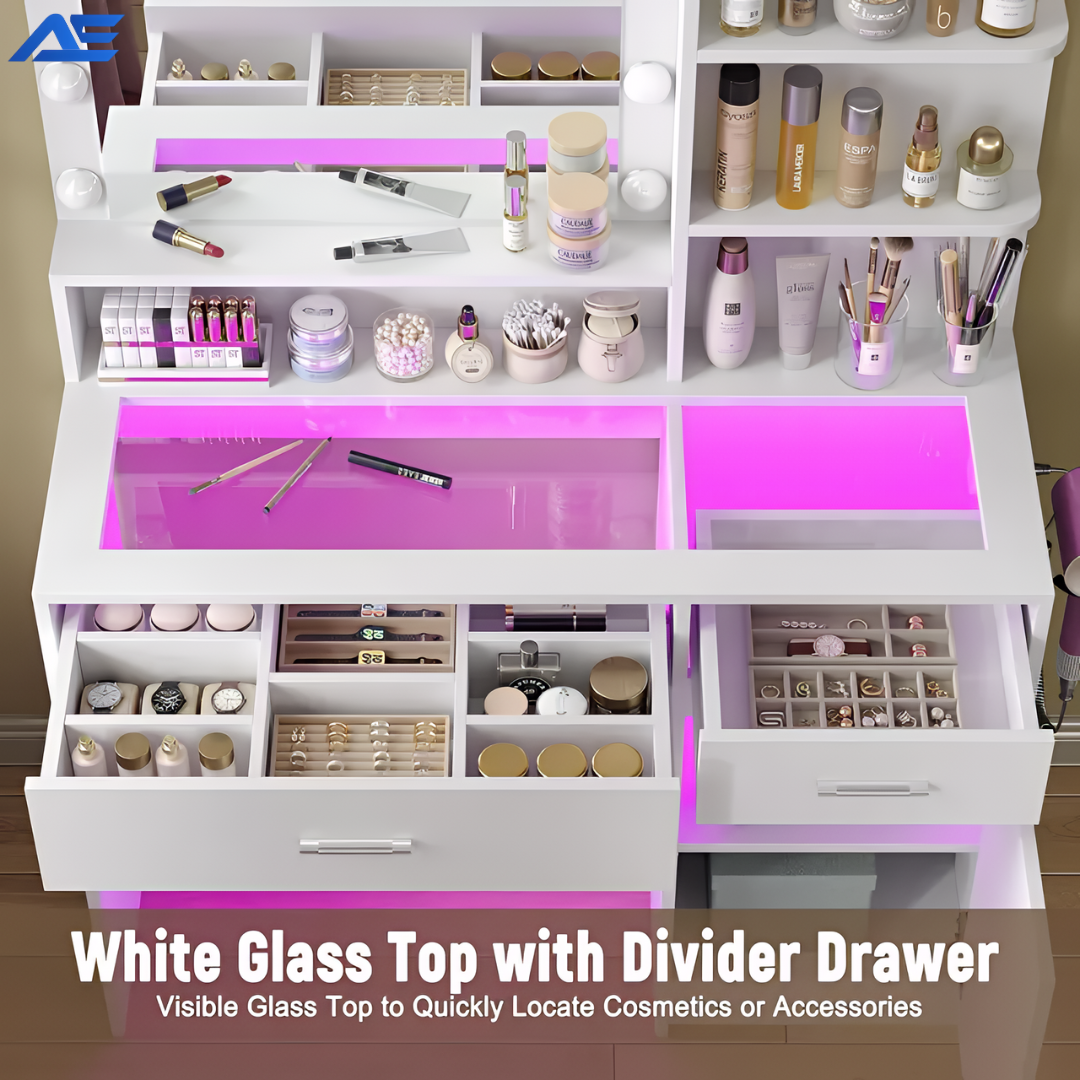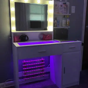 • I was surprised by how high-quality this vanity feels. The glass top looks elegant, the drawers slide smoothly, and the purple LED lighting looks amazing at night. It’s functional, stylish, and makes getting ready feel luxurious.