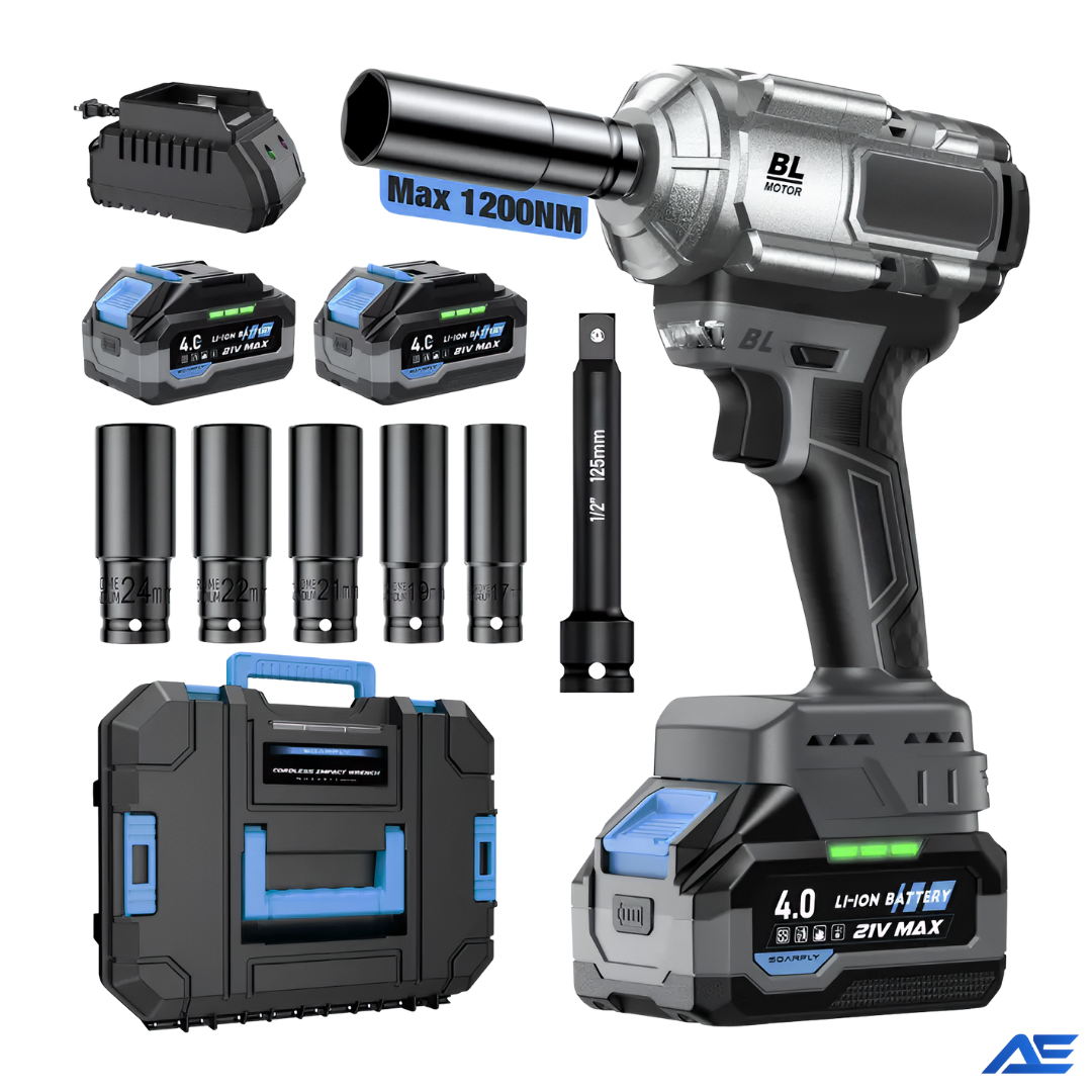 ImpactPro is a 1200NM (900 ft-lbs) cordless impact wrench for automobiles and trucks, featuring 3000 RPM power, 2× 4.0Ah batteries with a fast charger, and 5 sockets plus an extension bar for reliable, all-in-one performance.