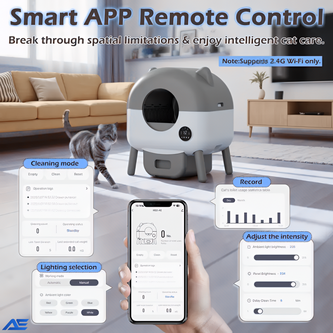 Meowry is an intelligent automatic cat litter box designed to make cat care effortless, hygienic, and stress-free. With smart app control via stable 2.4GHz WiFi, you can monitor usage, manage cleaning cycles, and receive real-time alerts anytime, anywhere. Adjustable ambient lighting improves visibility for your cat while adding a modern touch to your home.