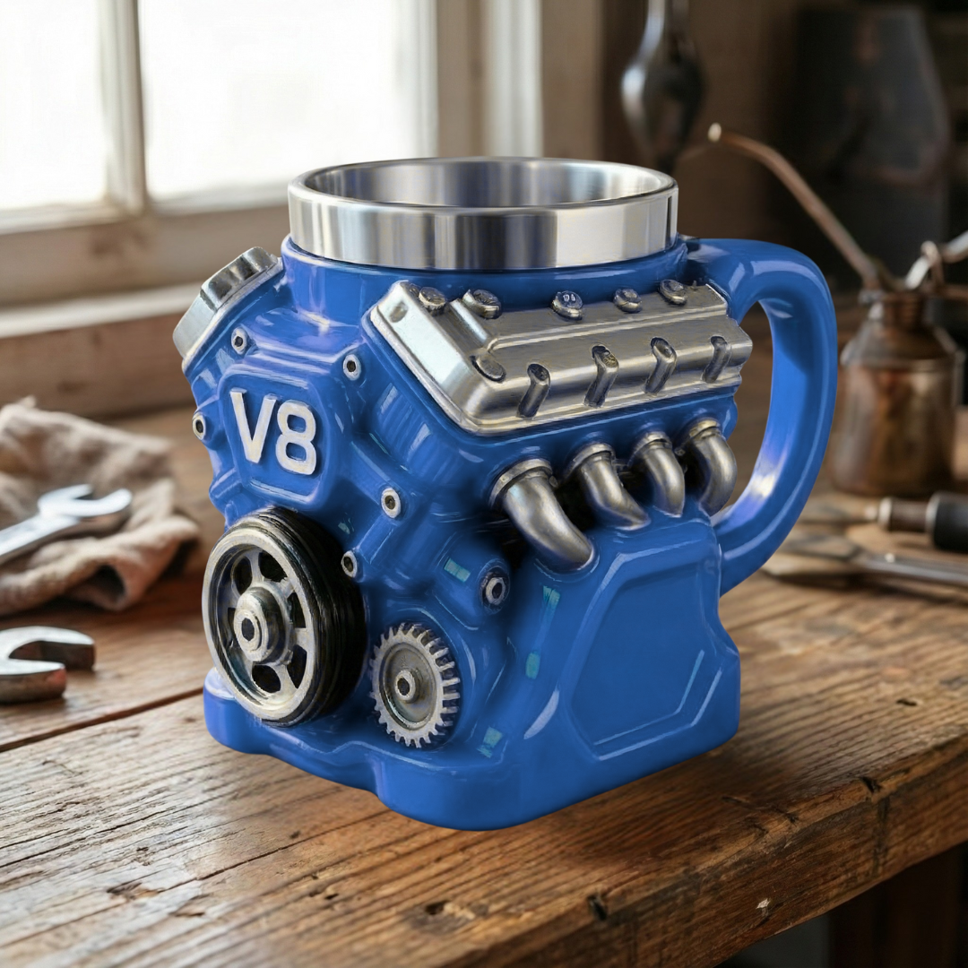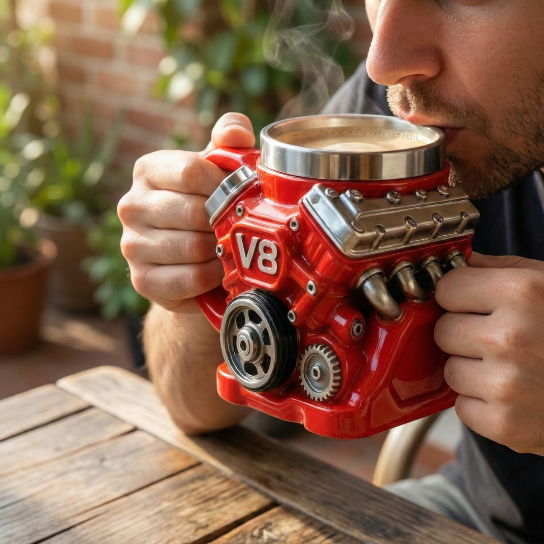 V8Mug is an engine-inspired coffee mug designed to resemble a powerful V8 motor block, featuring bold details and a sturdy build—perfect for car enthusiasts who want a touch of horsepower with every sip.